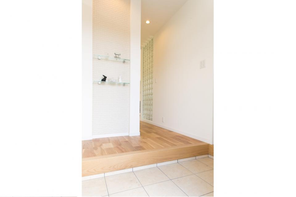 ガラスの飾り棚、そして光を通すガラスブロックを壁面に使用し明るい玄関です。