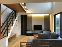 タイル&間接照明、リビングへ入るドアをハイドアを採用しました。間接照明が暖かい雰囲気にしてくれます。個だわりの造作テレビボードが目を惹きます
