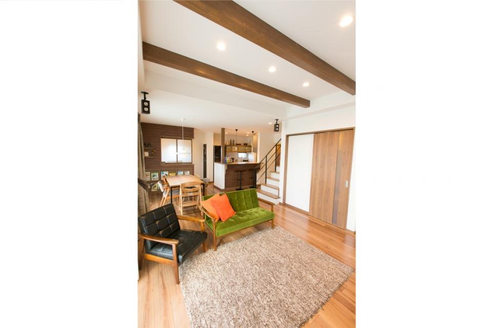 カラフルな色や色調の違う木目がありながらも、違和感なくまとまりのあるリビングですね。