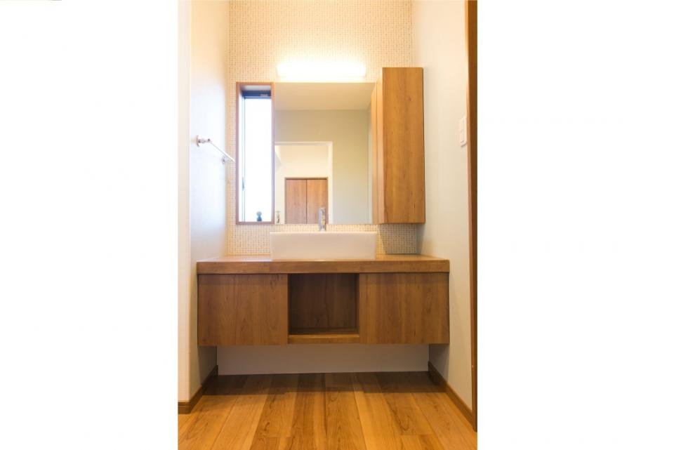 お手洗いの壁にも木目を使い落ち着いた空間に仕上がりました。