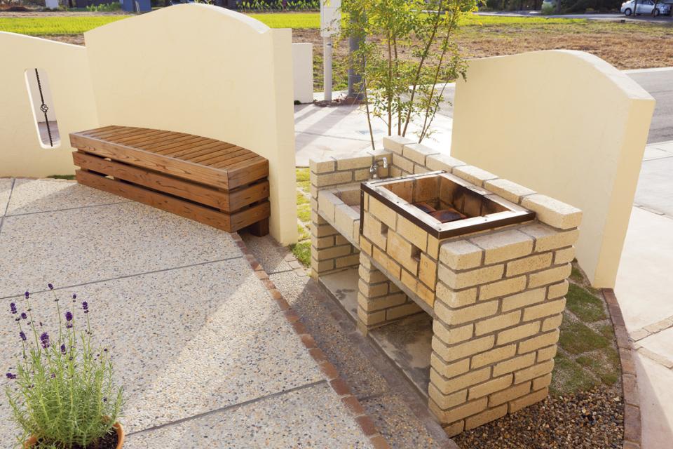 手作りBBQスペース&ベンチに皆が集います。