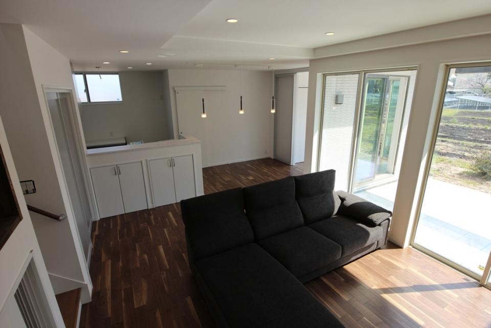 白を基調としたリビング。床の色が落ち着いた雰囲気にしてくれます。