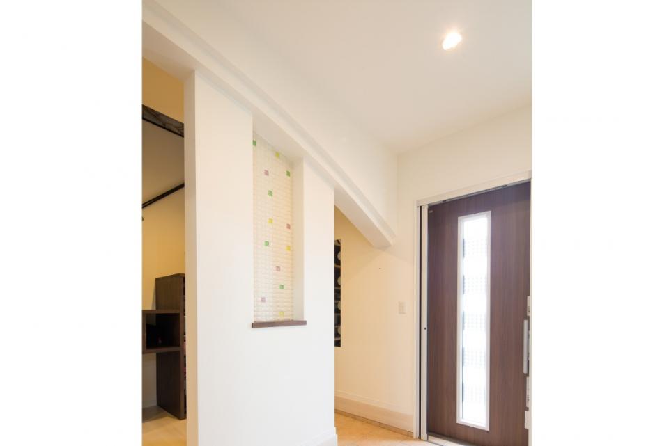明るい玄関のアーチの垂れ壁の奥には土間収納があり家族の靴や上着などを収納できます。