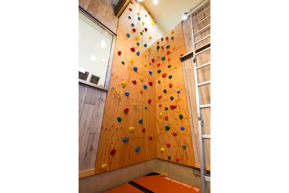 バイクガレージの中にはボルタリングの壁が!登るとロフトへ行けるんです。
