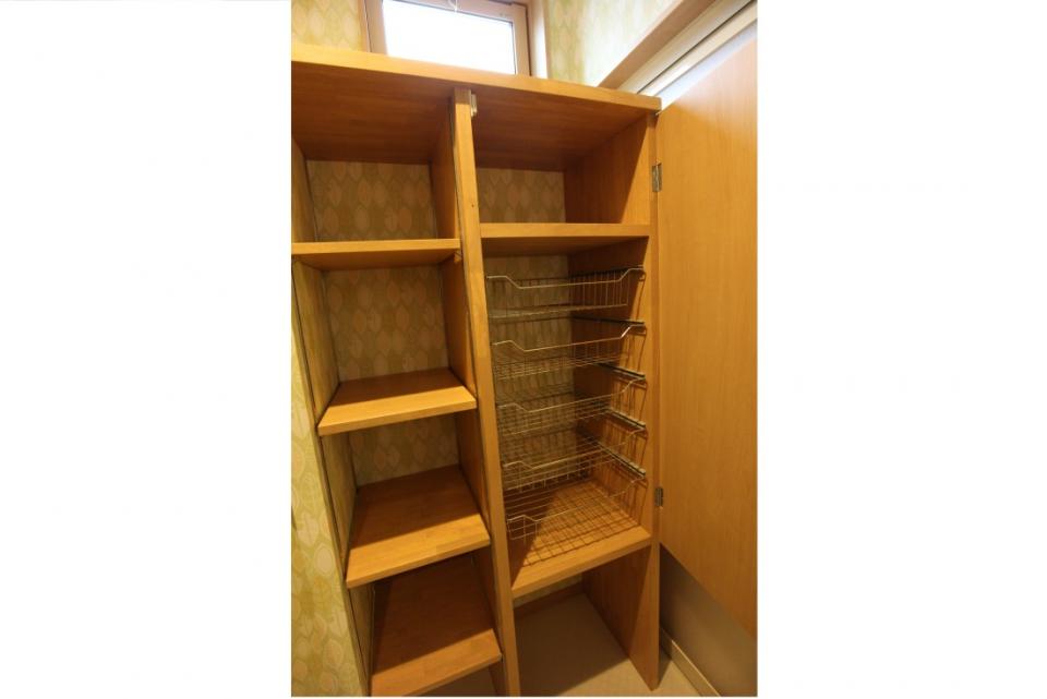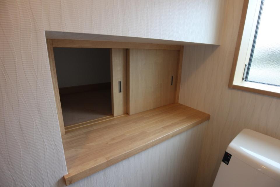 トイレの壁には階段下を利用した収納を作りました。