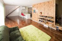 リビング北側には、旦那様のコレクションであるブリキ看板を飾ることが出来るOSB合板仕上げの壁を設けました。大好きな物が日常の生活に自然と溶け込んでいる、理想の住まいが完成しました。