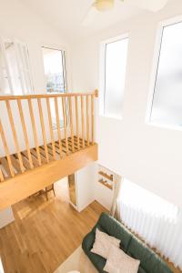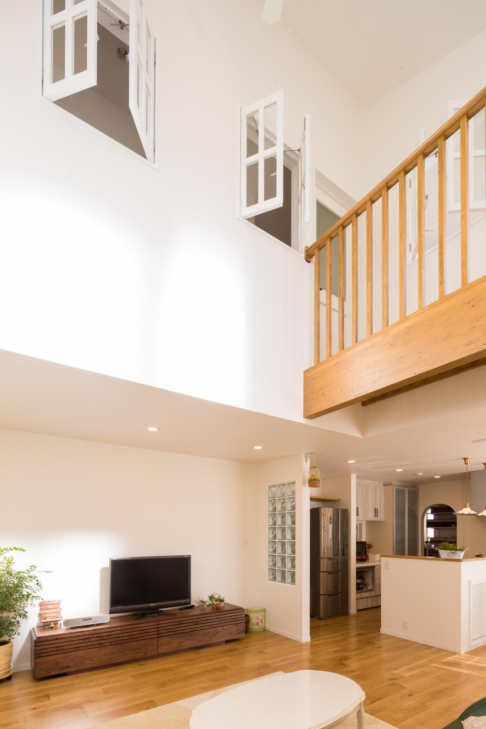 吹抜けにある小窓は風の通風計画や2世帯のコミュニケーションが出来る空間となります。