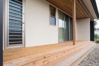 窓を開けた状態で軒下がリビングの延長としても感じることができるアウトドアリビンクがあるお住まいです。