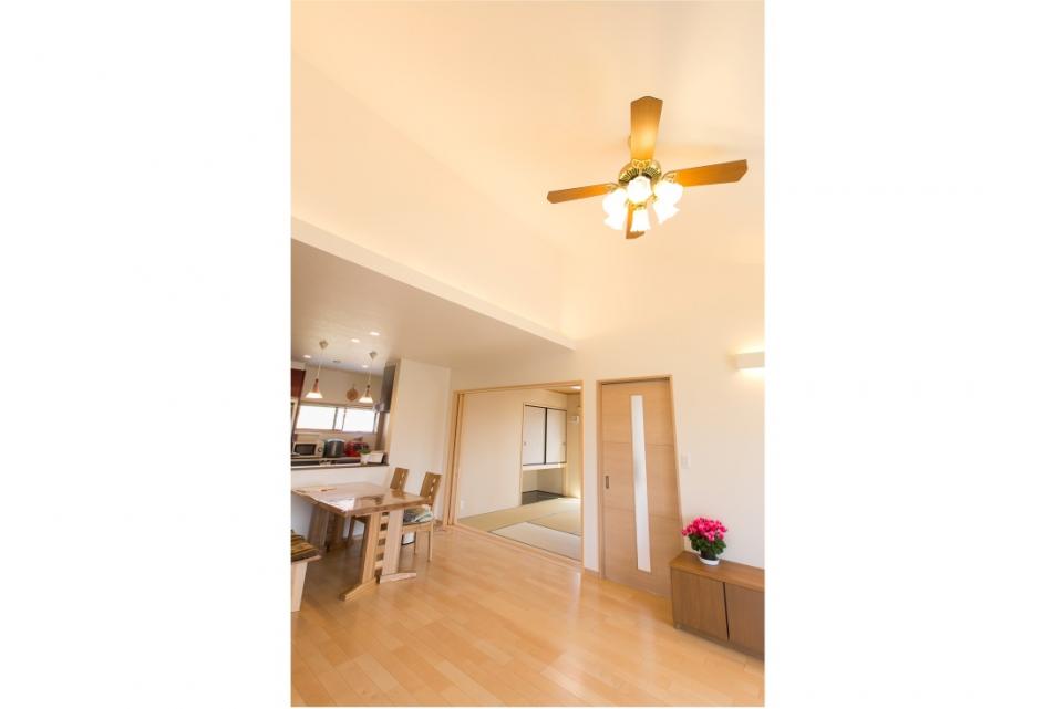 勾配天井で開放的なリビング。 間接照明でお部屋を素敵に演出しています。