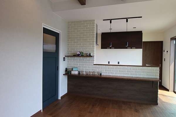 キッチンカウンター前の壁は白い煉瓦タイルでヴィンテージな空間を演出しております。